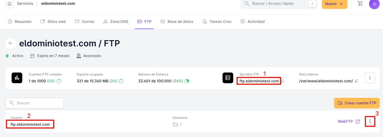 Los datos para acceder vía FTP los encontraremos en el área de cliente, dentro del apartado FTP del panel de gestión del alojamiento. Para acceder a él, desde nuestro área de cliente, pulsaremos en la opción “Hosting y Correo” y pulsamos sobre el dominio que tenga el plan de alojamiento del que queremos exportar la copia. Una vez dentro, en la parte superior, podremos acceder al apartado “FTP”.