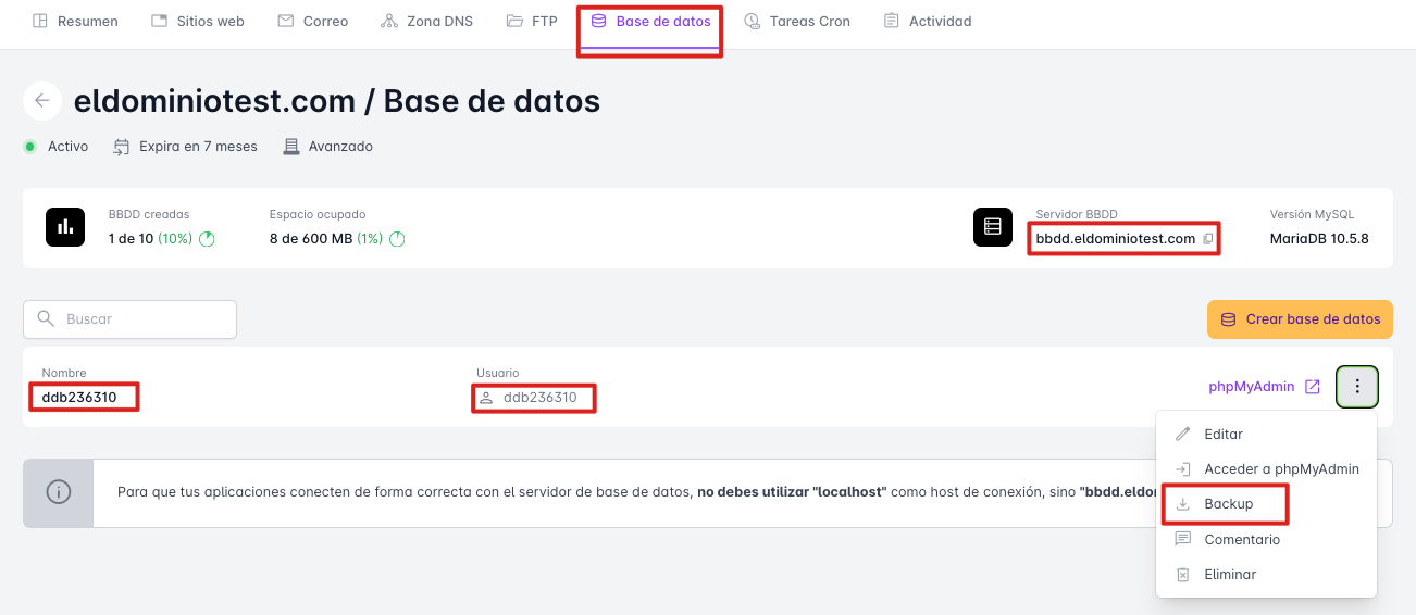 O incluso, obtener las credenciales, como el “Servidor”, “Nombre”, “Usuario” y “Contraseña” (La contraseña podrás verla/modificar pulsando “Editar” en el botón de más opciones) para usarlos para acceder a través de un programa externo como Workbench MySQL.