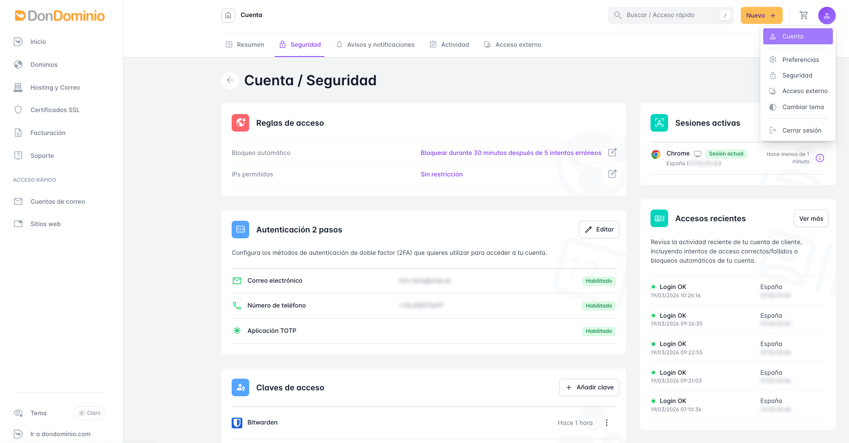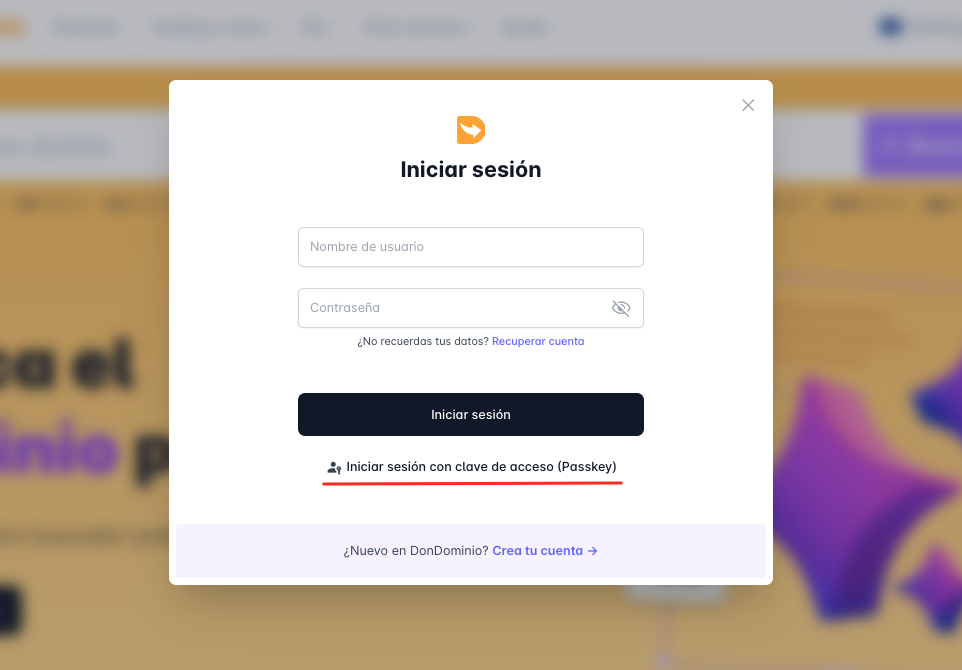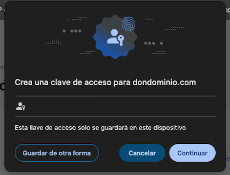 Con estos simples pasos ya tendremos configurada nuestra llave de acceso y podremos usarla para acceder a DonDominio seleccionando "Iniciar sesión con llave de acceso (Passkey)"