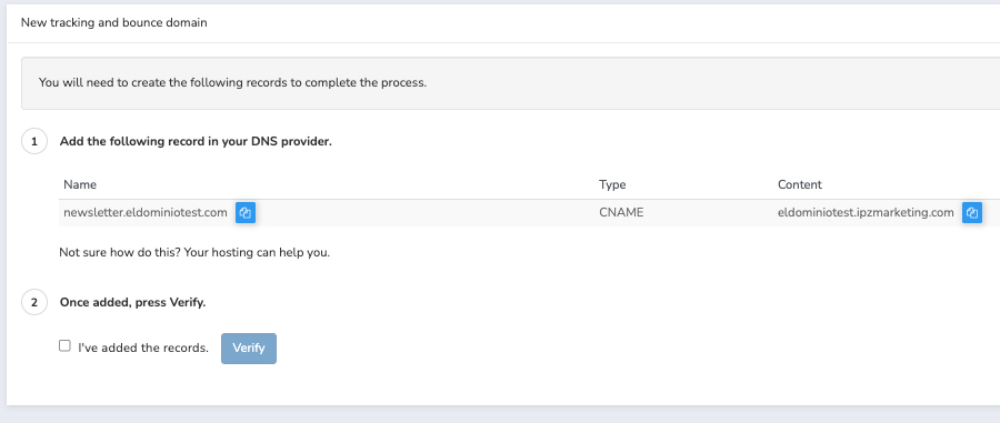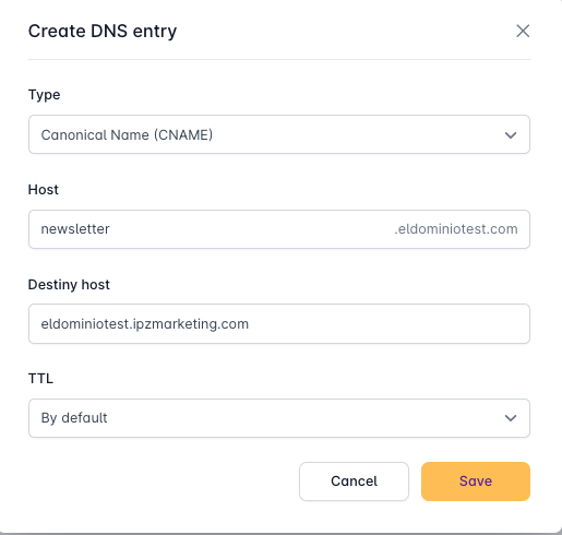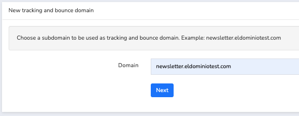 In the text field that appears, we will indicate the subdomain we wish to use, and it will show us the CNAME to create in our domain management area: