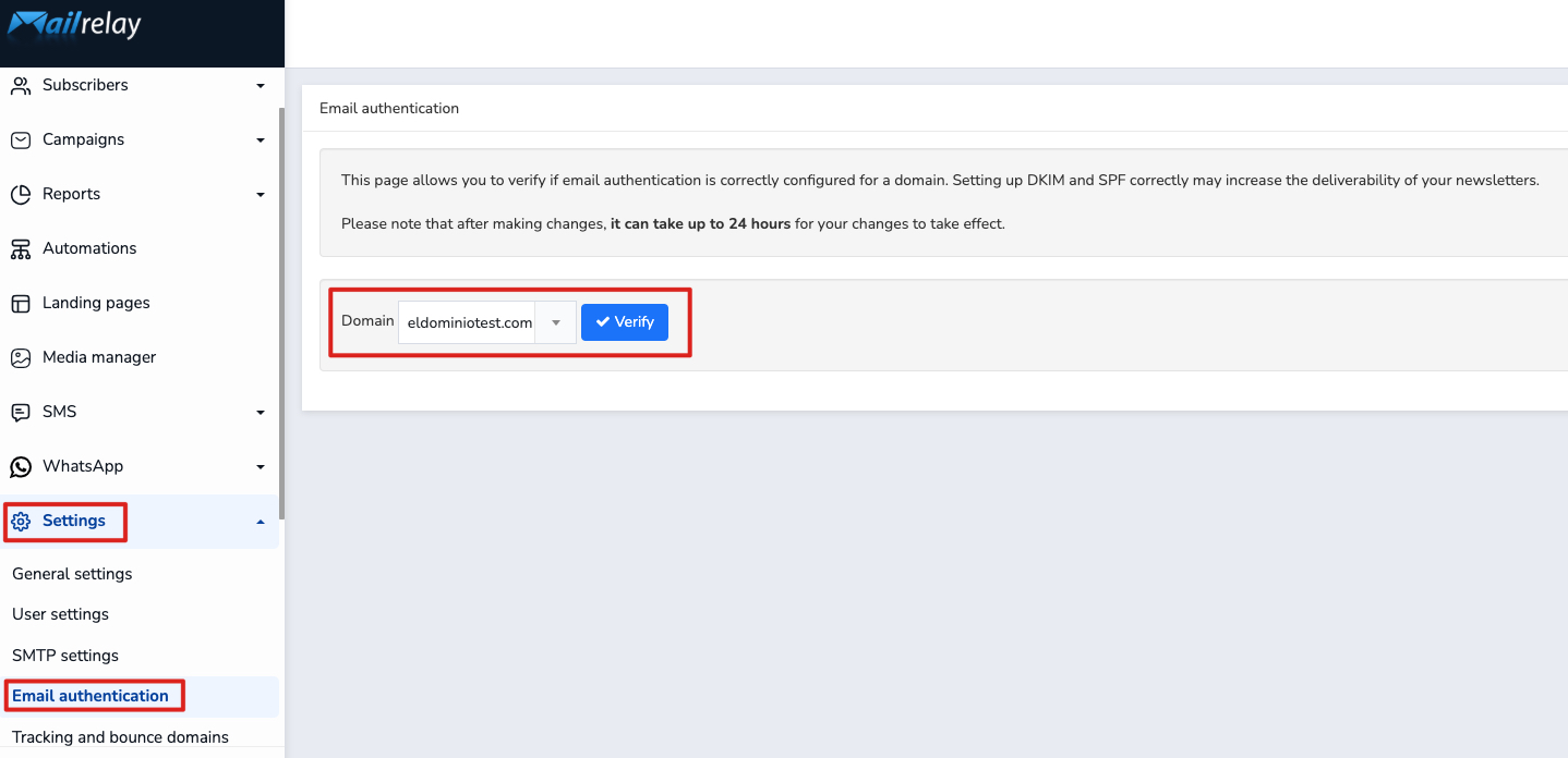 Now we have the custom domain configured, but to send without issues, we must return to the MailRelay panel and now access the "Email Authentication" section, in the "Settings" section of the side menu: