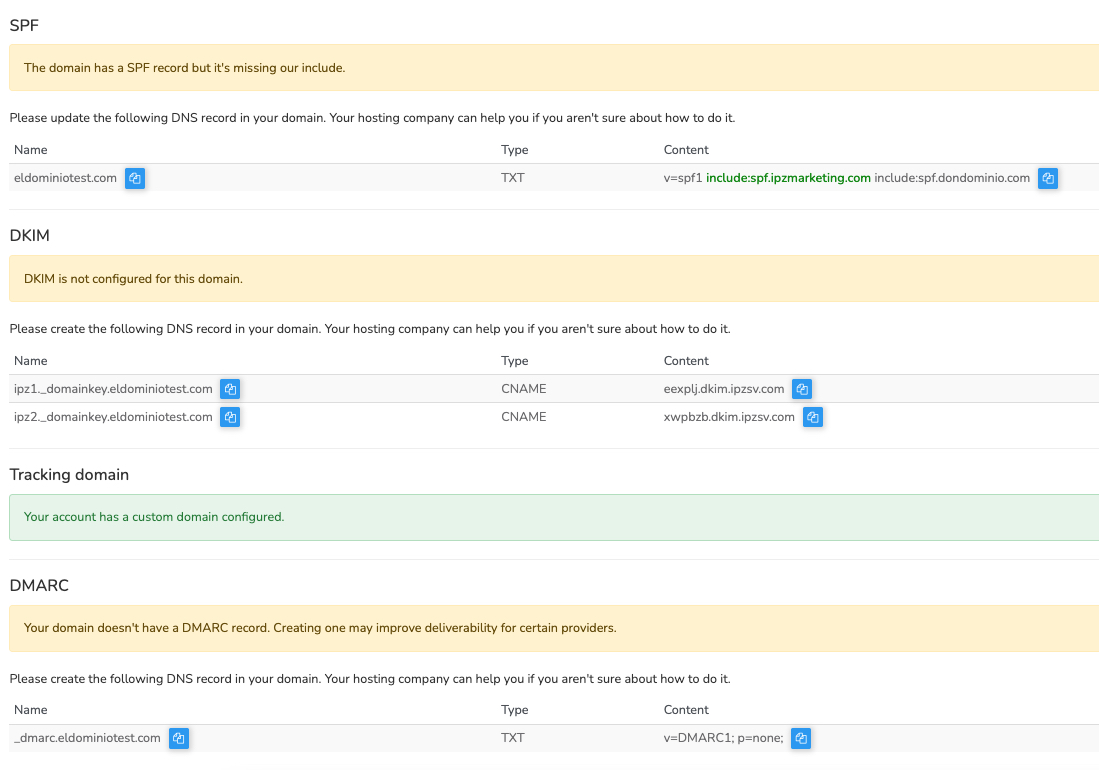 The "Values" we must enter are obtained from these instructions provided by MailRelay, after clicking "Check" in the "Email Authentication" section.