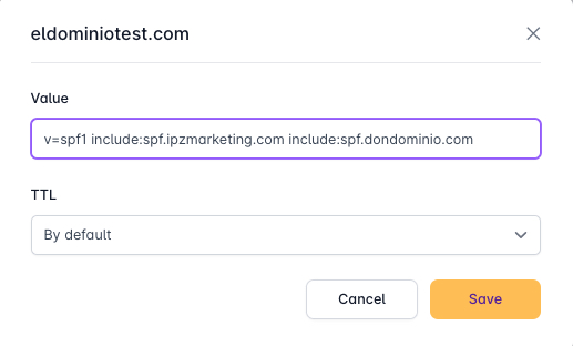The SPF record already exists, and instead of creating a new record, we must identify and "modify" the record to change its value to what MailRelay indicates.