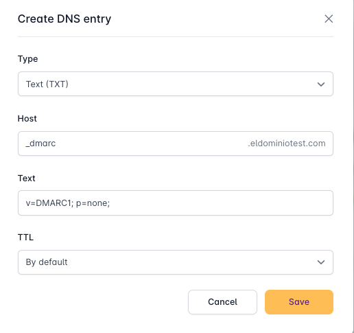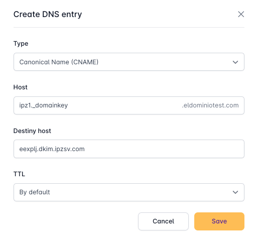 Once inside, we will create the DNS record with the data indicated in the previous image: